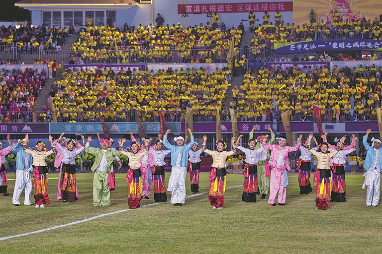 文艺表演率先拉开盛宴序幕。合唱《大中华》震撼犹在,身着傣族、景颇族等民族服饰的演员踏歌而来。德宏队队歌《边境之光》悠扬唱响,随后融入了傣剧元素的表演伴着古典音乐以现代的表演方式再现少数民族璀璨文化,全民歌曲《样样好》《如哩金旺》响起,傣家青年姑娘身着艳丽服饰,踏着轻快舞步欢快起舞,灵动裙摆随节奏翻飞,球迷观众纷纷跟着旋律鼓掌附和,歌声掌声交织成欢乐乐章。