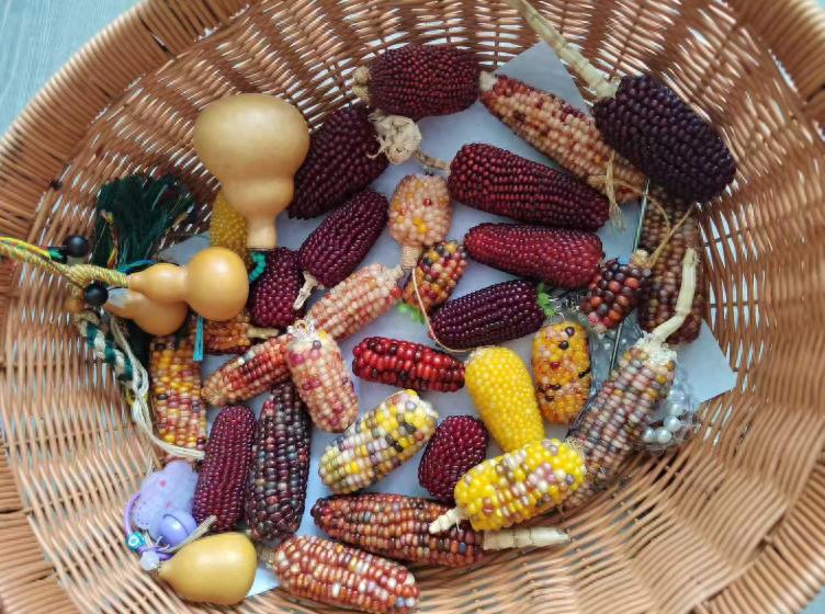 剥开玉米的外衣,形如玛瑙的玉米粒逐渐露出真容:有的红如鸽血,有的紫如葡萄,还有的同时有蓝、粉、紫、白等多种颜色。这些玉米外形小巧、颜色绚丽、纹路精致,惹人喜爱。