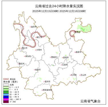 12月16日20时到12月17日20时:迪庆州东部和北部、丽江市北部、昭通市南部、曲靖市北部高海拔地区有雨夹雪或小到中雪,曲靖市南部、昆明市、文山州、玉溪市、红河州、西双版纳州、普洱市、楚雄州、丽江市南部多云间阴有小雨局部中雨,其他地区多云。