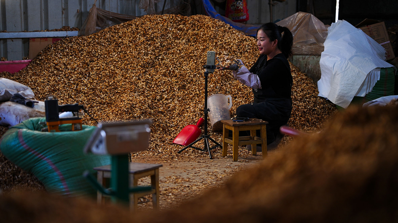 主播杨根余正在为村民直播销售石斛
