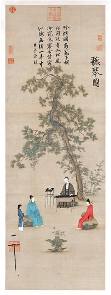 《听琴图》画中有两层内容,底层是图像,上层是文字。我们先说图像层。图像内容看上去不复杂,主要是一棵大松树、四个人物,外加一些小植物、石头、盆景之类。但是所谓“不复杂”只是“看上去”而已,细说的话那可很不简单。