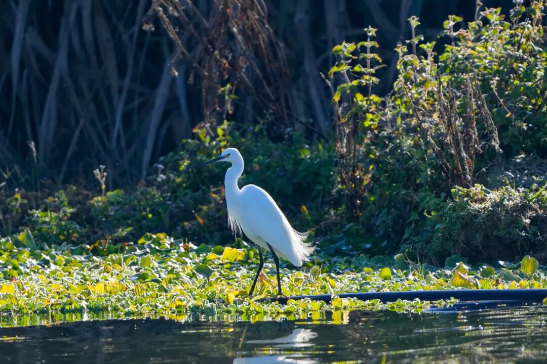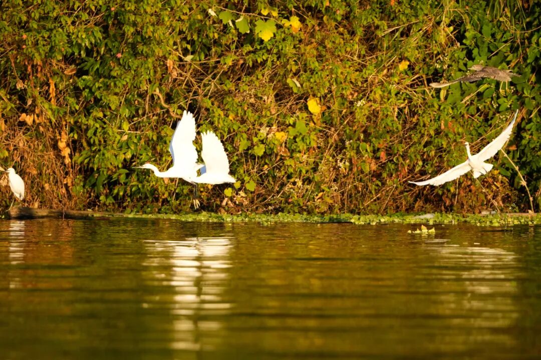 芦苇丛是鹭鸶的专属“游乐场”。它们的身影在枯黄的苇穗间穿梭,时而驻足梳理羽毛,洁白的羽毛与金黄的苇叶相映成趣;时而轻扇翅膀,低空掠过水面,留下一圈圈涟漪。风吹过芦苇荡,沙沙声夹杂着鹭鸶清脆的鸣叫,温柔了整个冬日。