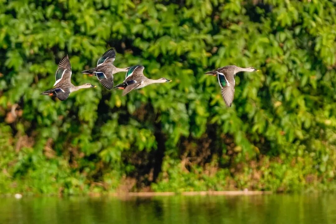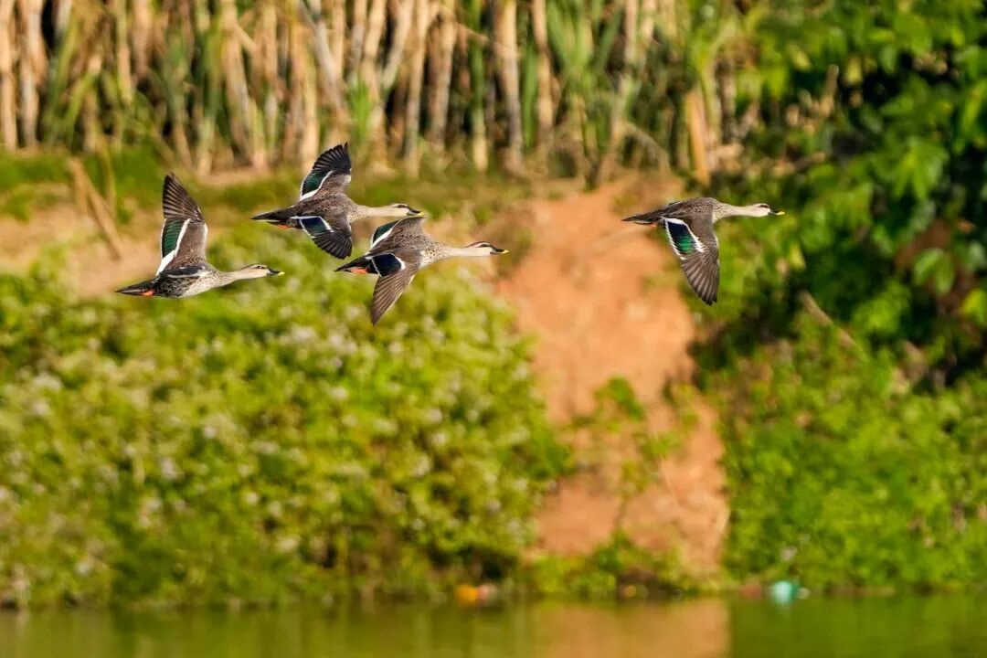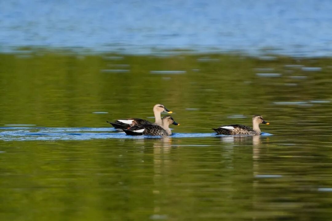 最活泼的当属成群的野鸭!它们在水面上肆意嬉戏,一会儿排着队“划水竞渡”,一会儿扎进水里“捉迷藏”,清脆的鸣叫声此起彼伏,像一群无忧无虑的孩子在打闹。暖阳升起时,野鸭们还会扎堆停靠在浅滩上,懒洋洋地晒着太阳,浑身的羽毛都透着暖意。