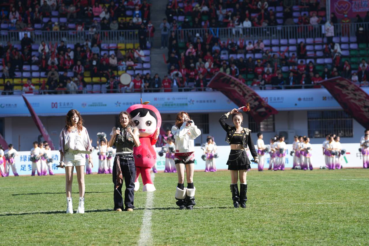 作为云南本土方言特色代表作《我家在云南》瞬间点燃全场,独特的滇味幽默,让观众沉浸式感受方言魅力与足球激情交织的欢乐海洋。紧随其后的是一支特别的表演团队——从昭通田间地头走出的草根女团“云南土ne1”。四位成员舞步整齐、活力四射,她们将本土气息与潮流唱跳相融合,以接地气的方式传递着对家乡的热爱与足球的激情,引发现场观众强烈共鸣。