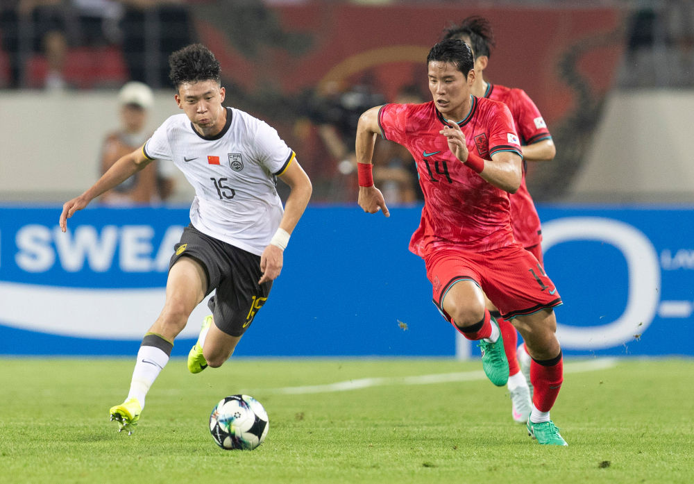2025年7月7日,中国队球员王钰栋(左)在比赛中拼抢。新华社发(全休相摄)