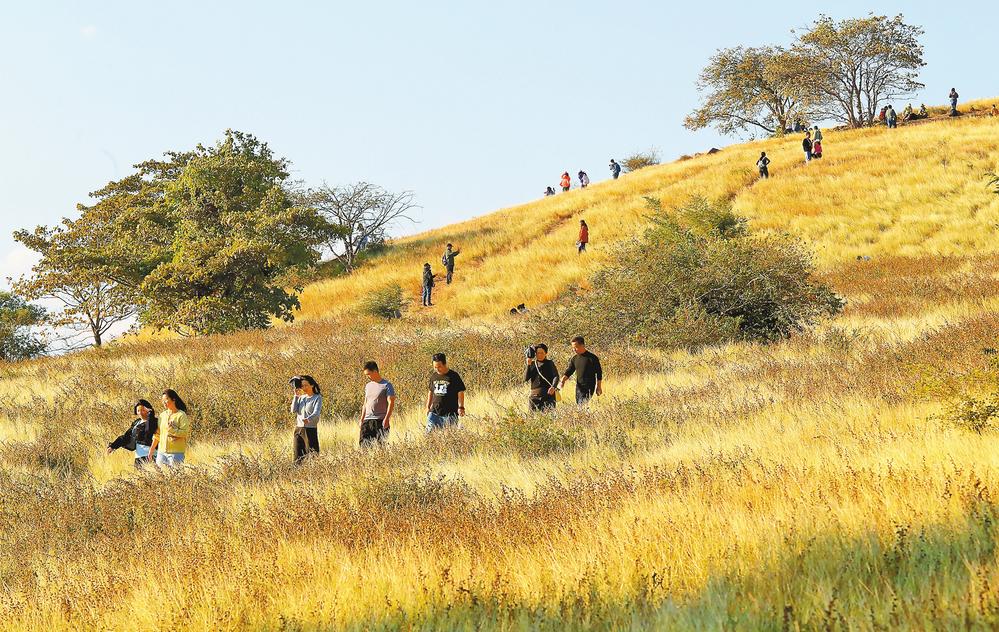 进入1月以来,元江哈尼族彝族傣族自治县萨王纳草原成为徒步爱好者、摄影发烧友及旅居游客的“暖冬天堂”。萨王纳草原位于元江河谷东岸,是热带稀树草原生态系统的典型代表。每年冬季至次年三四月,草地披上金装,漫山遍野的草浪绵延起伏,旱生乔木点缀其间,宛如一幅壮美的非洲草原画卷。(云南日报 记者杨峥/摄)