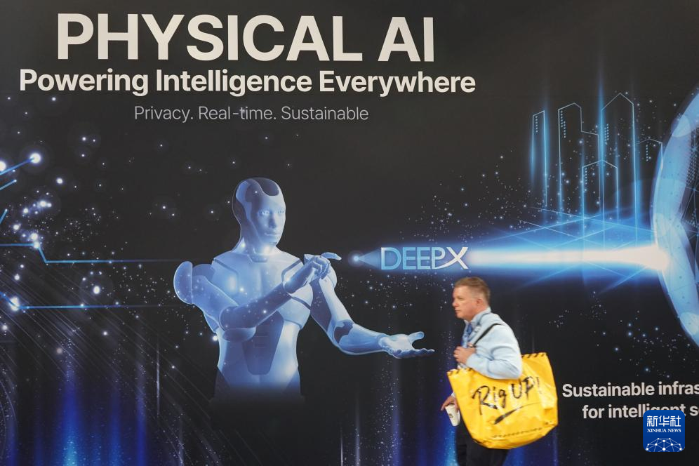 1月7日,一名男子在2026年美国拉斯维加斯消费电子展上走过印有“物理AI”字样的展台。新华社发(曾慧摄)
