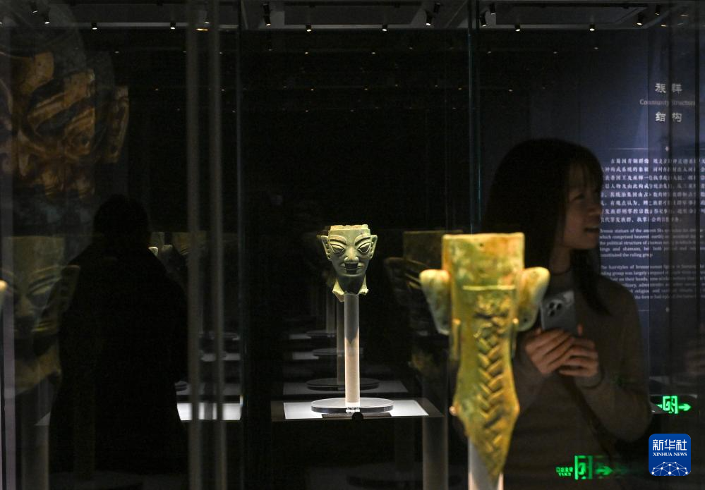 1月18日,观众参观展出的青铜人头像。新华社记者 金良快 摄