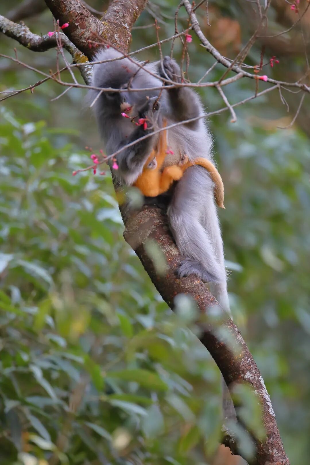 印支灰叶猴妈妈怀里还抱着长着金色绒毛的猴宝宝,从身体大小和毛色来看,这些猴宝宝应该刚出生不久。猴宝宝躺在妈妈怀里,时而探出毛茸茸的小脑袋观察周围,时而颤颤巍巍地伸出小手采摘冬樱花,画面格外温馨。
