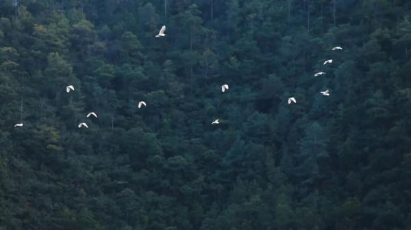 倘若你用清脆的嗓音向它们致意,白鹭便会应声而起,成群结队飞向天际。暮色渐浓,先是几只倦了的白鹭率先归巢,栖于树梢,静静眺望远方,等候同伴归来。