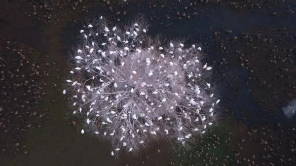 二十分钟后,一群群白鹭从四面八方陆续飞回,不过十分钟光景,整棵柳树便从树梢到枝干、从外层到内里,都落满了白鹭。这一幕,恰似一株千年古树汲取了天地灵气,刹那间焕发出惊艳的光彩。