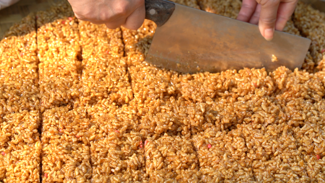 另一边,新榨的红糖块被投入锅中,然后加水慢熬,并不停搅拌,直至糖块完全融化,熬煮出浓稠起泡、色泽红亮的糖浆。这时把滚烫的红糖水趁热浇入炒好的米花中,锅铲翻飞间,糖浆与米花充分交融,每一粒米花都裹满甜香。大家迅速将拌匀的食材压实定型,待其冷却变硬后,用刀划切成大小均匀的方块,一块块香甜软糯的富宁米花就新鲜出炉了!
