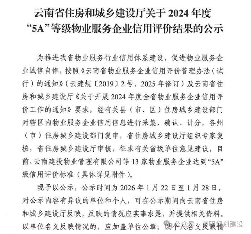 近日,云南省住房和城乡建设厅发布《关于2024年度“5A”等级物业服务企业信用评价结果的公示》。经审核,共有13家物业服务企业达到“5A”级信用评价标准。其中,昆明市有3家企业入选。