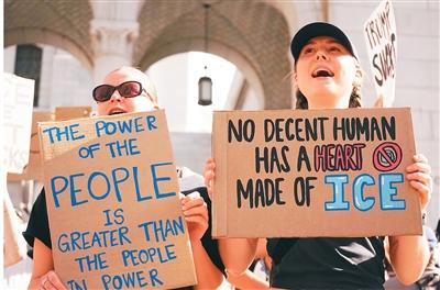 近日,民众在美国加利福尼亚州洛杉矶市政厅前手举标语参加示威活动,反对移民与海关执法局的暴力执法行动。