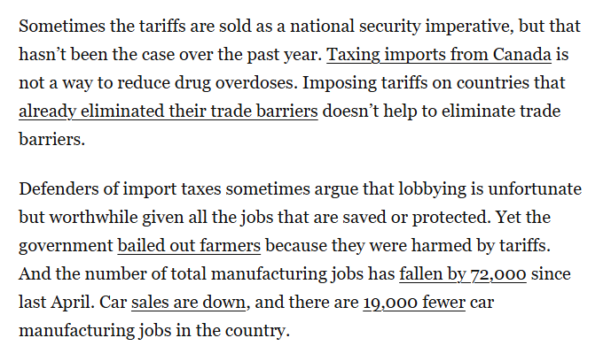 文章还认为,有时关税被包装成“国家安全需要”,但过去一年的事实并非如此。对加拿大进口商品加税无助于减少药物过量死亡;对已取消贸易壁垒的国家加征关税也无益于消除贸易壁垒。关税捍卫者有时声称,游说能保护就业,因而值得。然而政府曾救助因关税而遭受损害的农民。而自去年4月以来,美国制造业岗位总数减少7.2万个,汽车销量下降,汽车制造业岗位减少1.9万个。
