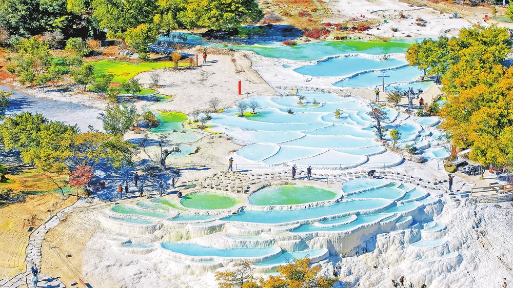 位于香格里拉市三坝乡白地村的白水台是我国最大的华泉台地,历经千万年钙质沉淀,形成了雪白晶莹、纹理如画的地质奇观。在暖阳下,这片被誉为“仙人遗田”的钙化台地纹理分明,层层乳白台池如玉砌梯田,其间潺潺泉水如晶莹宝石,吸引着各地游客前来观光。(云南日报 记者胡妤雅/摄)