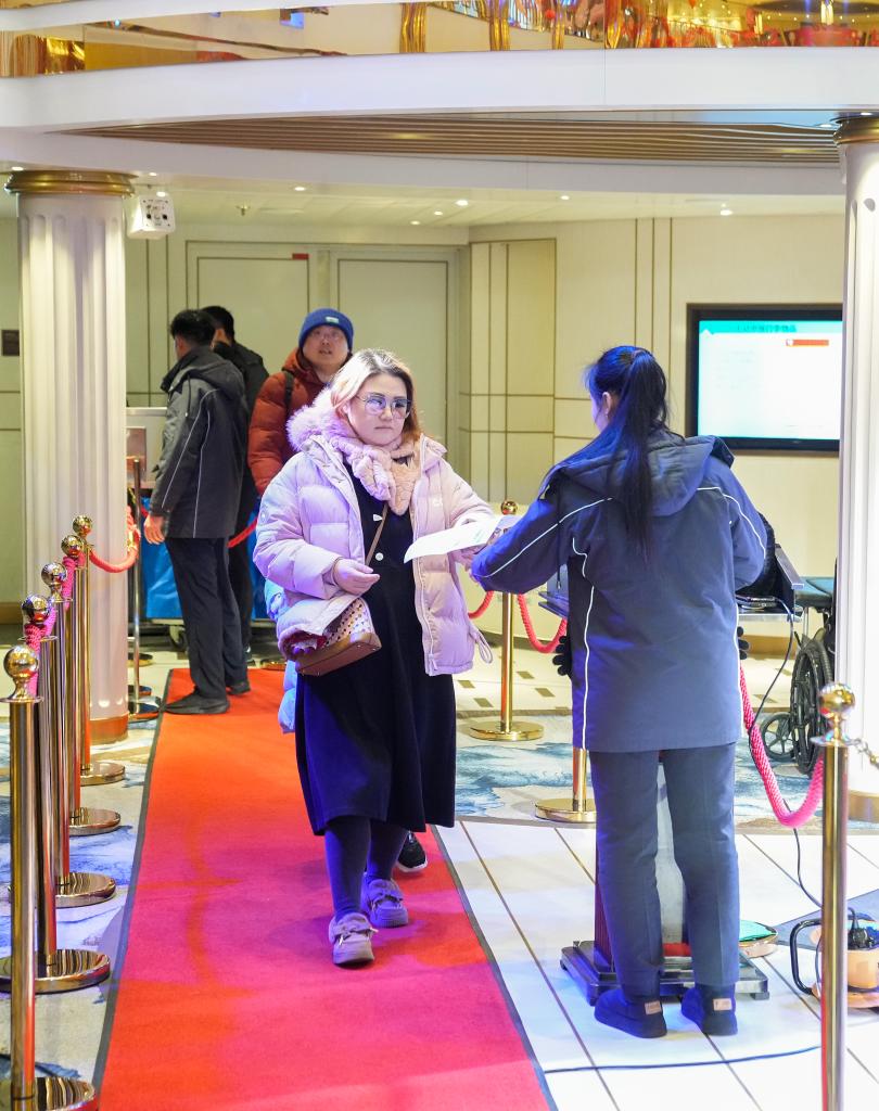 走进“爱达·魔都号”,邮轮已经换上了红红火火的春节装饰,除了精心准备的海上特色团圆宴外,马年新春主题航次还安排了写春联、剪纸、非遗手作等文化体验,配合海上升旗仪式、“五福”快闪、民俗讲堂等活动,让旅客感受仪式感十足的海上中国年。