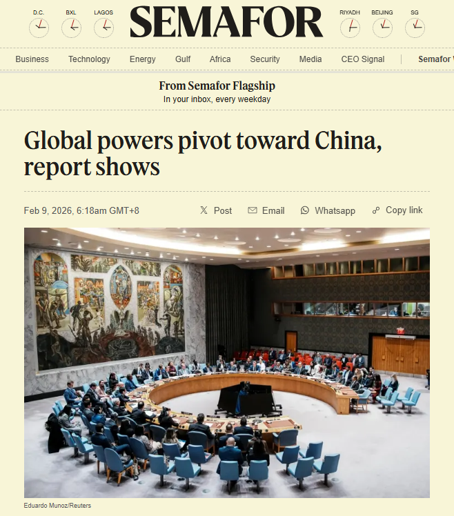 美国新兴新闻机构“旗语”近日的一篇报道认为,一份新报告量化了许多地缘政治分析师数月来的观点:全球重心正从美国转向中国。