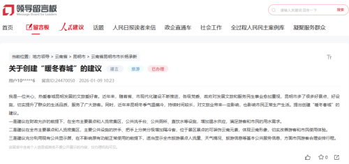 近日,有市民通过人民网领导留言板为昆明文旅及城市便民设施建设建言献策,昆明市文化和旅游局、昆明市城市管理局积极回应市民期盼,持续擦亮“暖冬春城”城市名片。