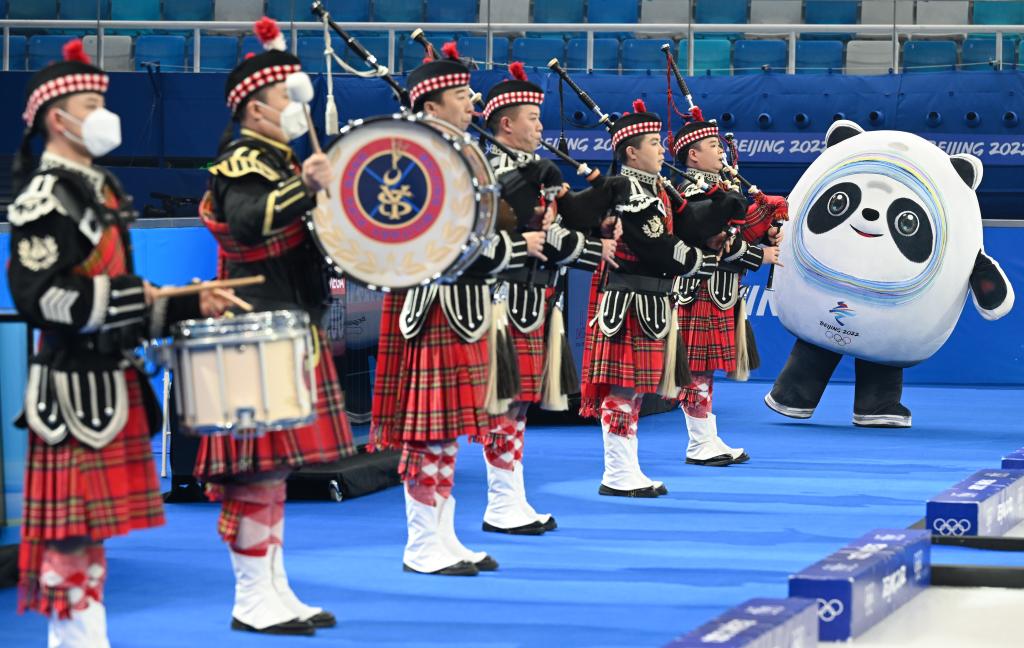 2022年2月19日,“冰墩墩”在北京冬奥会男子冰壶金牌赛开赛前热场助兴。新华社记者 李贺 摄