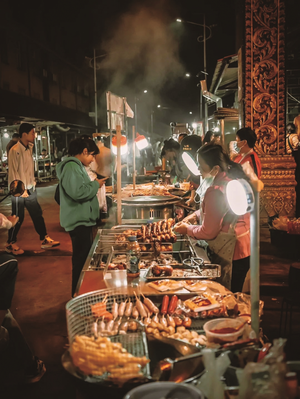 这里的小吃摊,是年味的灵魂——傣味凉拌的酸辣、粑粑卷的糯香、烤猪蹄的焦脆,每一道风味都裹着乡愁的温度,成为游子心中那条回不去的故乡巷。