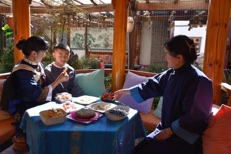 一家人与客栈经营者张容菥一起分享着纳西甜品(2026年2月5日摄)