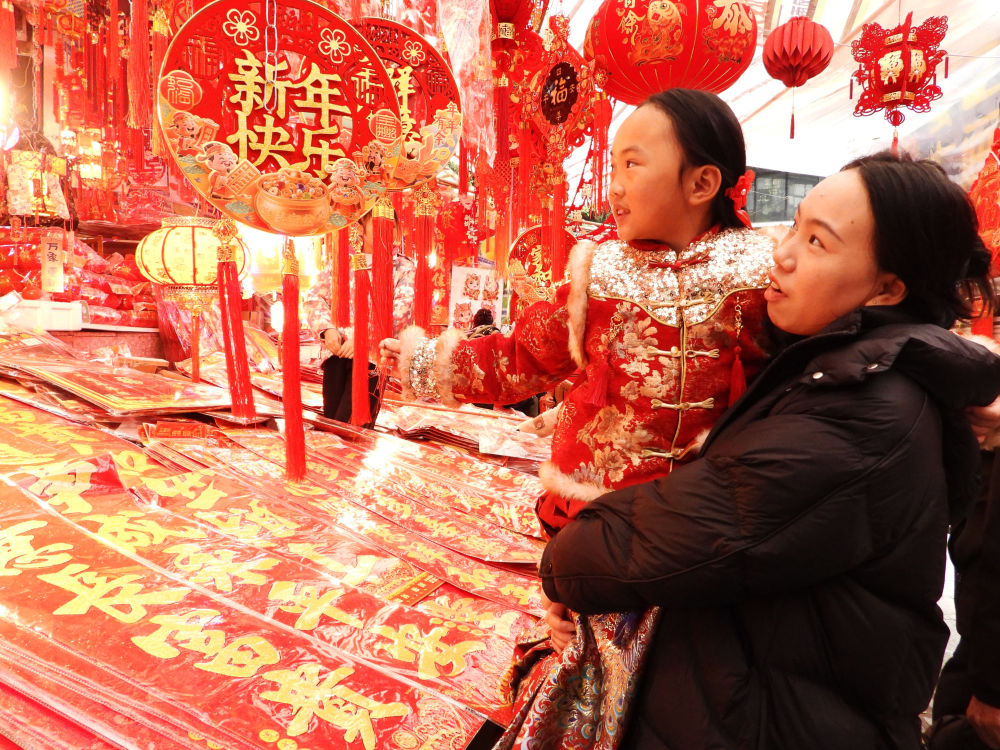 ↑ 2月14日,人们在北京市平谷区的年货大集选购饰品。新华社发(刘满仓摄)