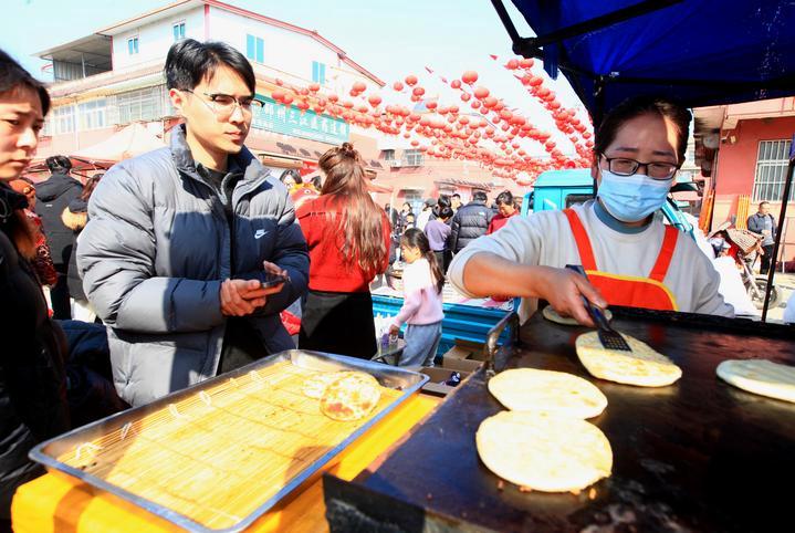 在江苏邳州邢楼镇的邢楼大集上,来自山东枣庄的火烧摊主李女士在烤火烧(2月14日摄)。