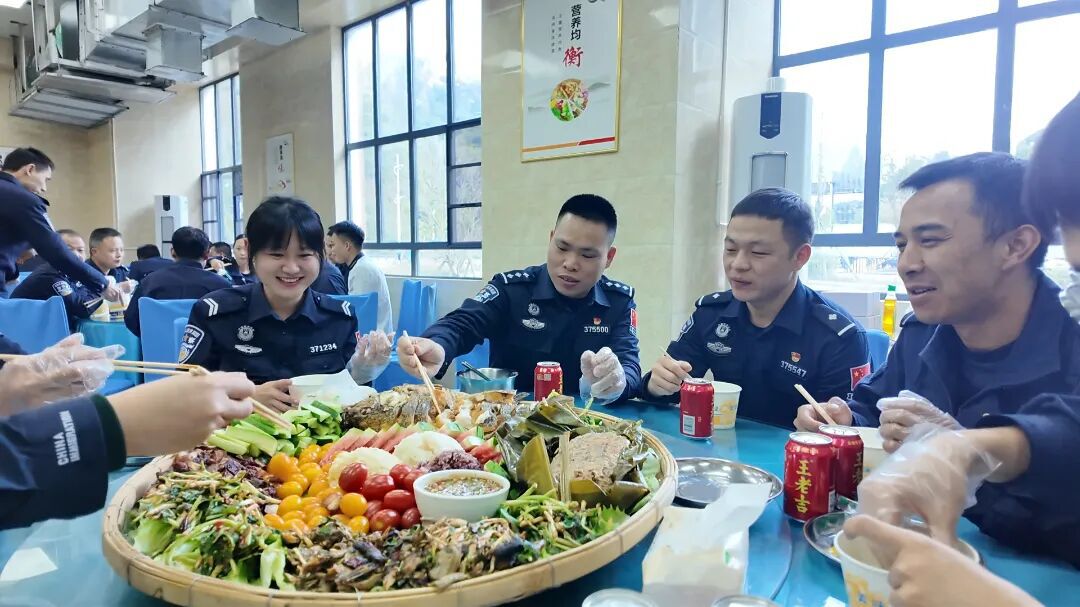 “大家一年到头坚守在岗都辛苦了,这顿年夜饭没能与家人团聚,是因为我们责任在肩,守着这道重要的关卡。大伙儿吃好饭打起精神上勤,站好岗。”执勤四组组长李林辉话语里是对组员的体恤,更藏着守关的坚定。