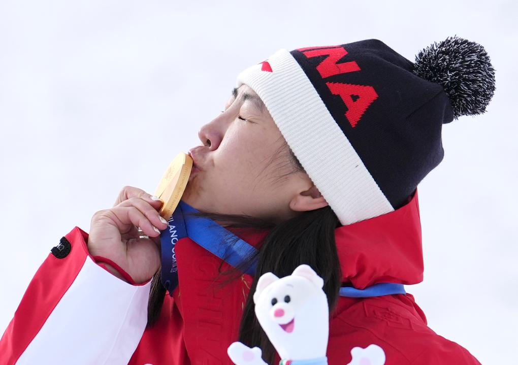 2月18日,中国选手徐梦桃在颁奖仪式上亲吻金牌。新华社记者 胡超 摄