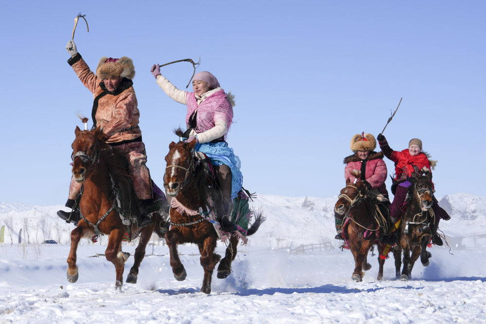 在新疆青河县狼山景区赛马场,当地群众参与马上运动“姑娘追”欢度新春佳节(2月17日摄)。新华社发(叶尔江·木哈买提 摄)