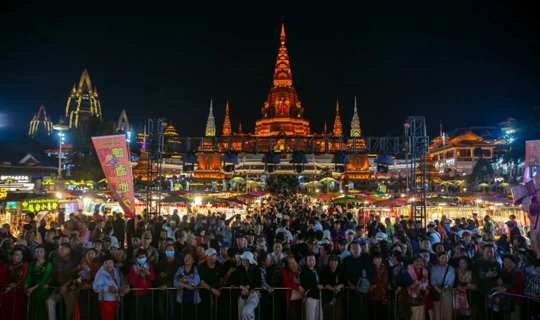 当夜幕降临,星光夜市灯火璀璨,大金塔上空的新春烟花秀如期绽放,照亮了澜沧江畔的浪漫夜空。