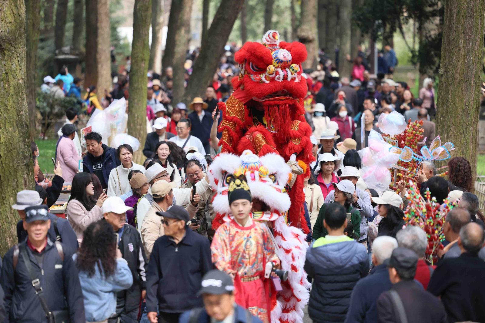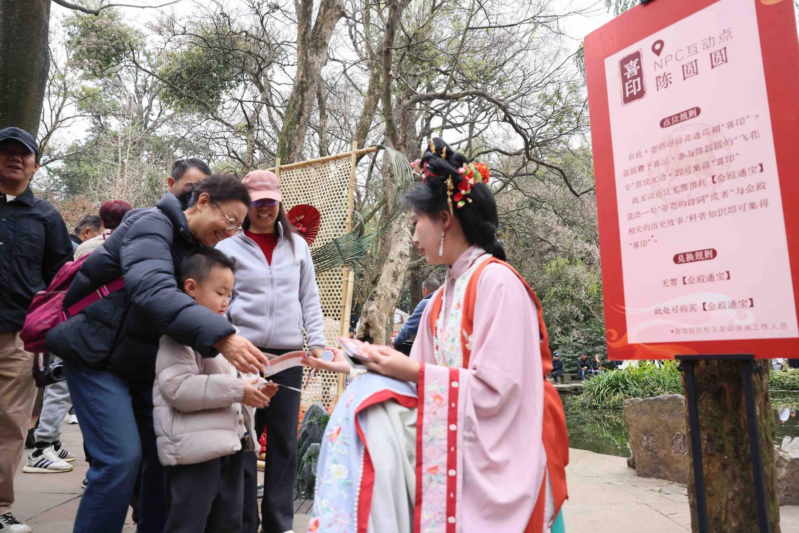 今年庙会全新推出的“神行甲马·乐赏山茶”古风游园打卡活动,成为现场的一大亮点。紫薇园的锦鲤仙子、秋园的陈圆圆、钟楼的山茶花神等NPC与游客亲切互动,沉浸式的游园体验让年轻游客流连忘返。600余亩的山茶园内,40余万株山茶花竞相绽放。逛完庙会的游客纷纷漫步茶花园,在姹紫嫣红的花树下拍照留念,一边欣赏春日美景,一边感受自然之趣。