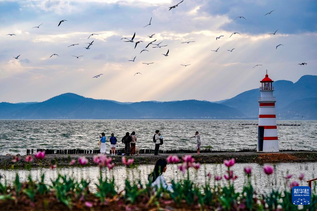 春日暖阳下,昆明滇池碧波荡漾,远山如黛,红嘴鸥翩跹起舞。游人沿岸漫步、驻足拍摄,共绘出一幅生动宜人的春游画卷。(新华社记者 陈欣波 摄)