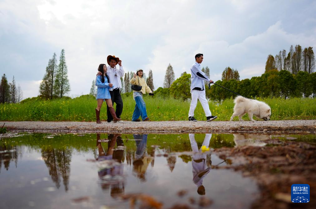 2月26日,游客带着宠物狗在滇池边游玩休闲。