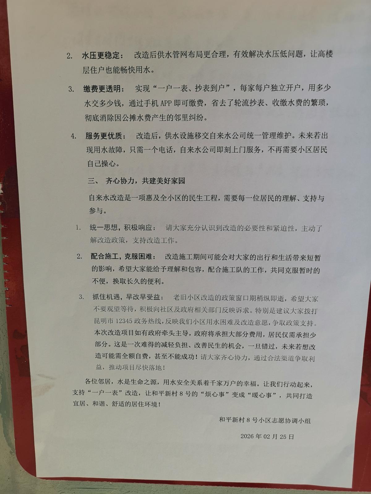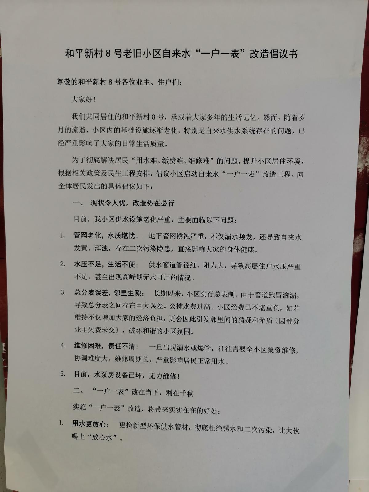 2月25日张贴的《和平新村8号老旧小区自来水“一户一表”改造倡议书》指出——