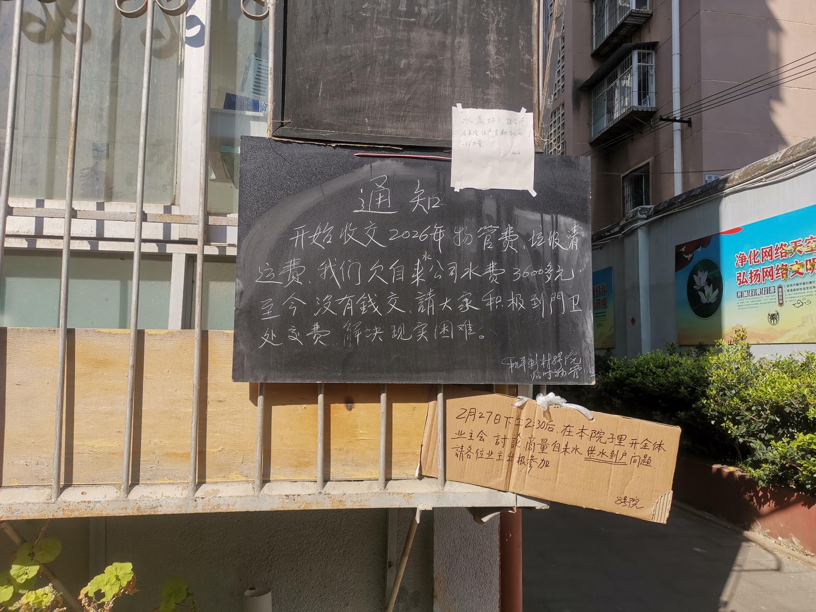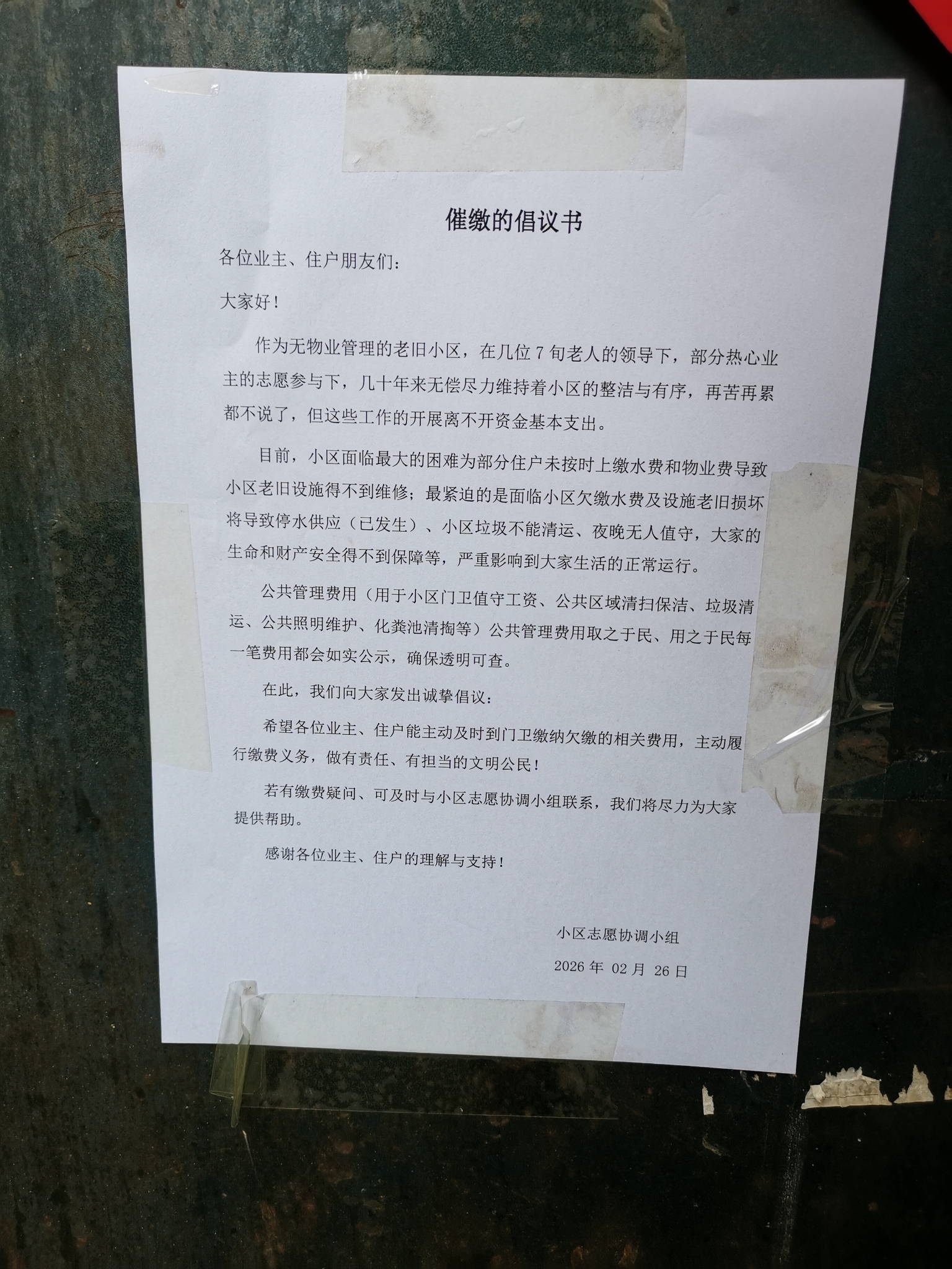 该小区为无物业管理的老旧小区,多年来依靠几位七旬老人及热心业主无偿维持小区运转。当前小区存在住户拖欠水费、物业费,导致老旧设施无法维修的问题;已出现停水、垃圾无法清运、夜间无人值守等情况,危及居民生活与财产安全。小区公共管理费用用于门卫、保洁、垃圾清运、公共照明维护、化粪池清掏等,费用取之于民、用之于民,每笔支出都会公示,希望住户主动补缴欠费。