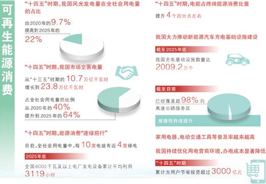 可再生能源绿色电力证书的全年交易规模超过历年交易量总和,绿色能源消费促进机制加快建立。