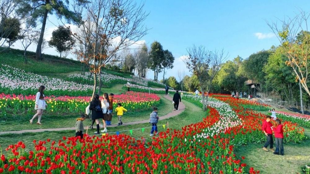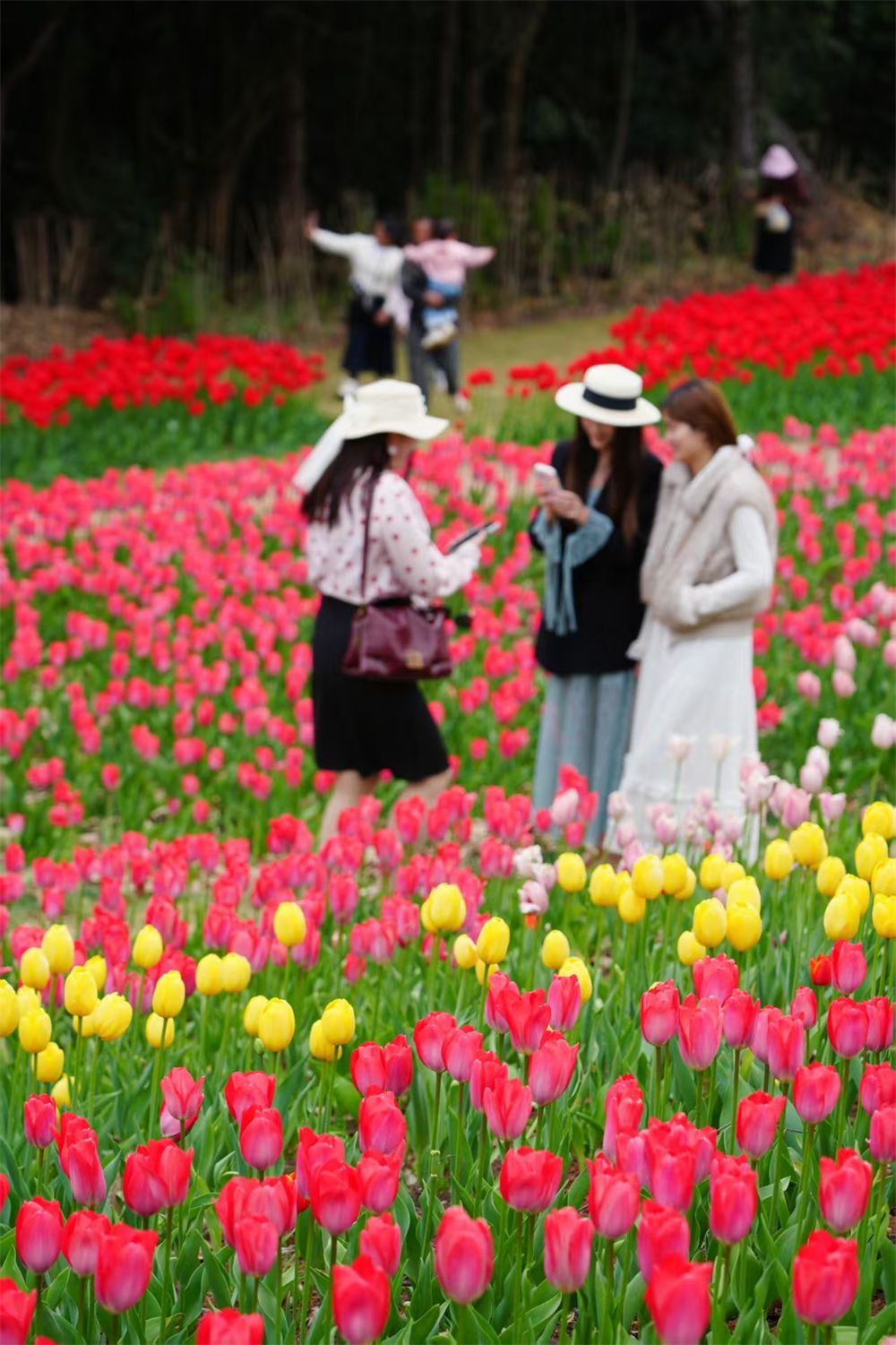 春日里6000㎡郁金香花海盛放,10万株红粉黄白花朵交织成梦幻花浪,拍照氛围感拉满。