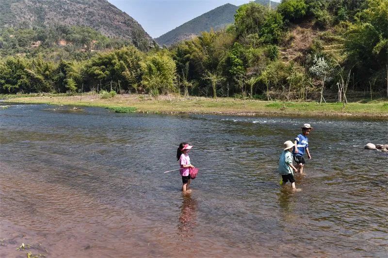 流经竹林的溪流有宽有窄,宽的地方可划竹筏漂流,狭窄之处则宛若小巷,江水清澈空灵,水中游鱼戏虾、彩色卵石历历可数。在浅滩处,可以脱鞋下水,拿着网兜捉鱼摸虾,也可以和小伙伴打水仗,野趣十足!