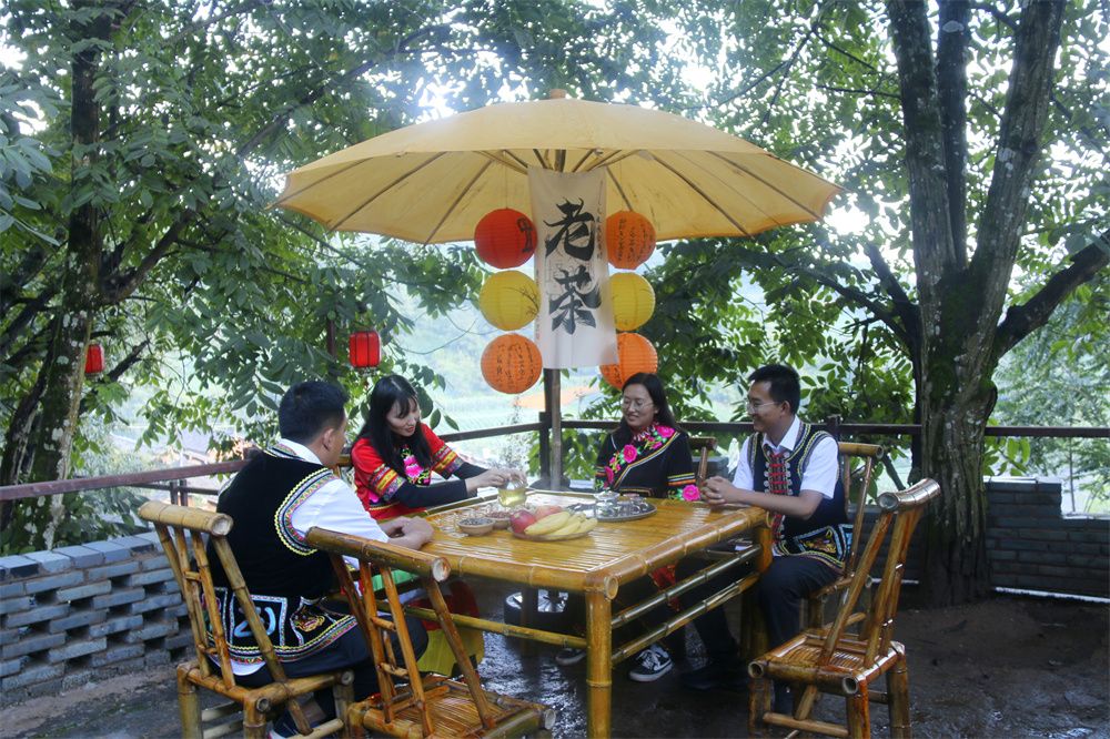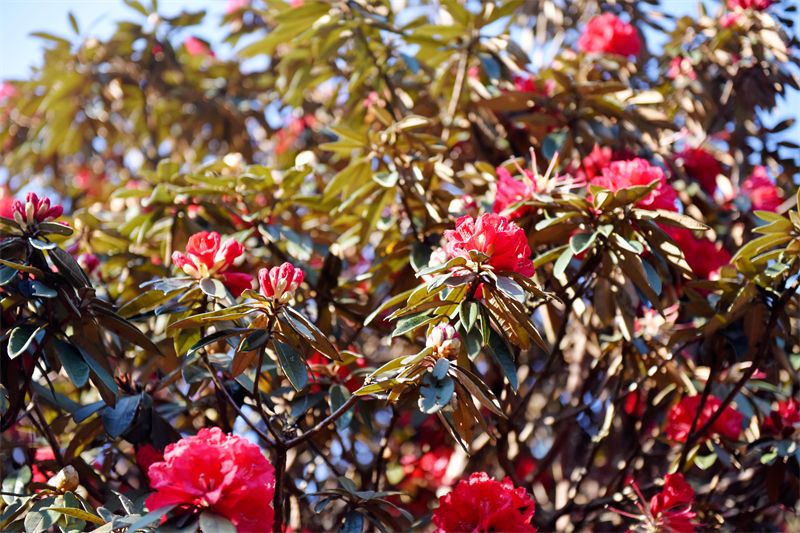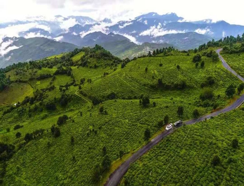 从茶园开车往白竹山顶走,一路峰缓谷幽、景色迷人。到达山顶,一大片绿茵茵的高山草甸呈现在眼前,周边是一望无际的原始森林,林间马缨花盛放,火红的花树与青山相映,赏心悦目。