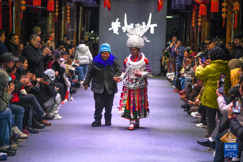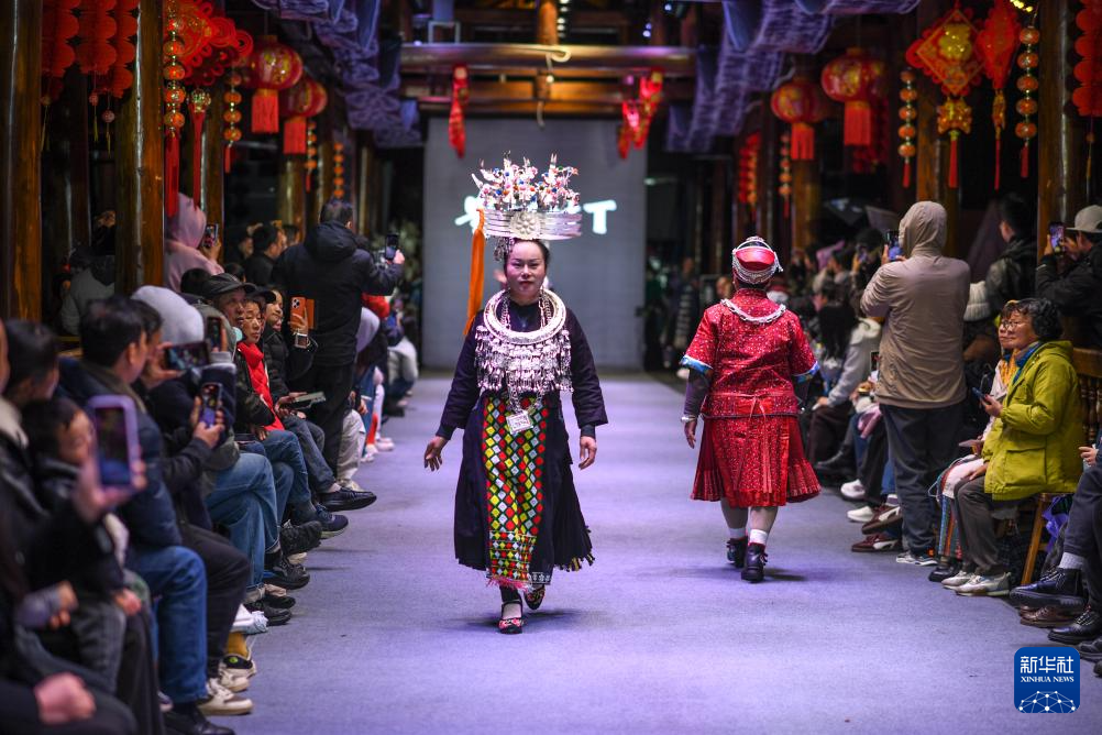 3月8日,人们在贵州省凯里市苗侗风情园观看“村T”民族服饰秀。