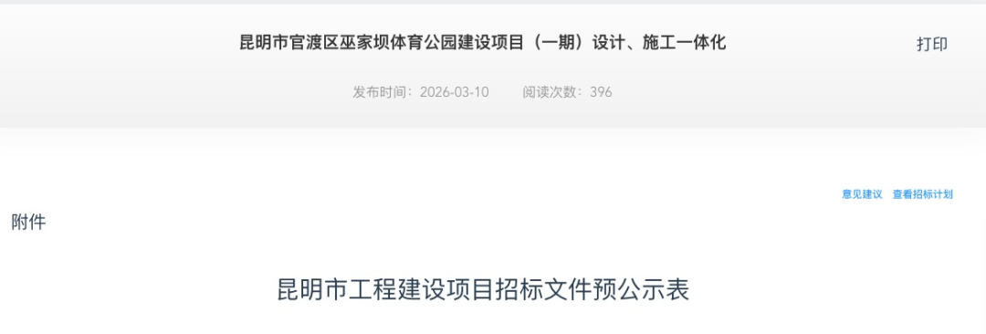 3月10日,云南省公共资源交易信息网发布《昆明市官渡区巫家坝体育公园建设项目(一期)设计、施工一体化》招标文件预公示。