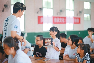 湖南省怀化市通道侗族自治县万佛山镇木脚村,大学生在给孩子们上趣味AI实验课。
