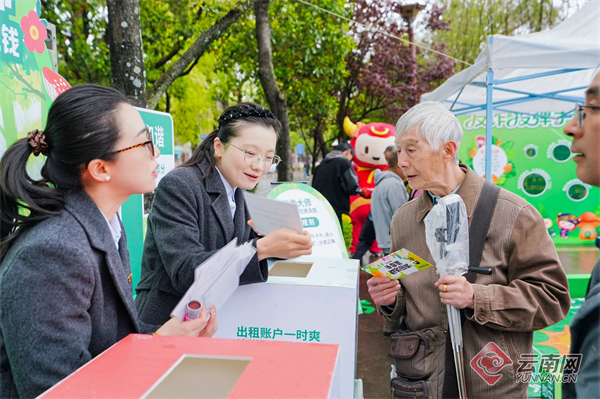 3月13日上午,昆明翠湖公园九曲桥前广场上,数十名身着统一制服的快递小哥接过金融知识锦囊和安全头盔,他们将化身“金融知识流动宣传员”,把防范金融风险的知识随同包裹驶向大街小巷、送进千家万户。