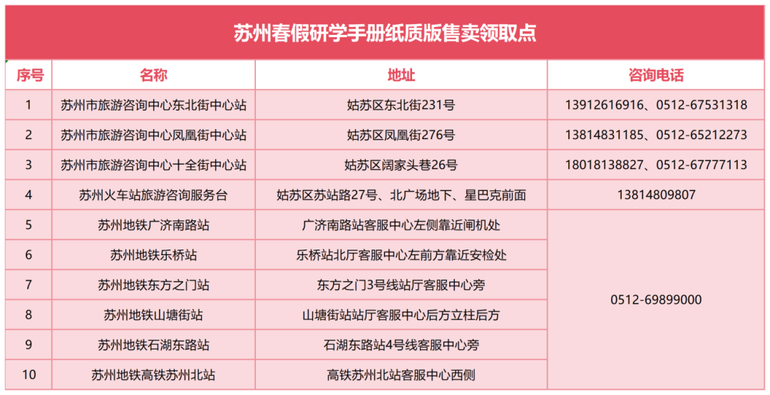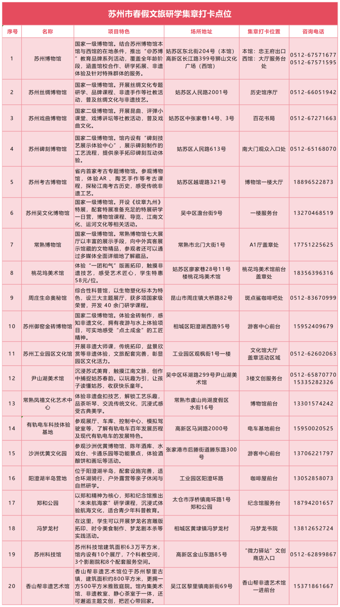20家苏州市春假文旅研学集章打卡点位均有研学手册售卖,此外还在各文旅服务点位和苏州地铁部分换乘站点设置了手册售卖领取点。