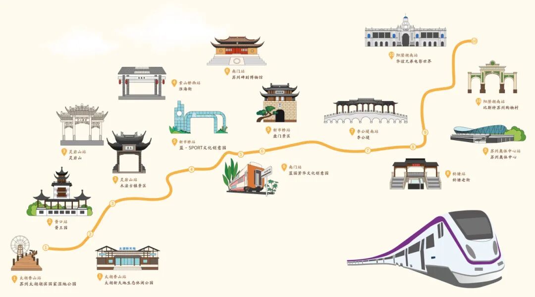 核心点位:灵岩山/木渎古镇(灵岩山站)、金鸡湖李公堤(李公堤南站)、阳澄湖(阳澄湖南站)