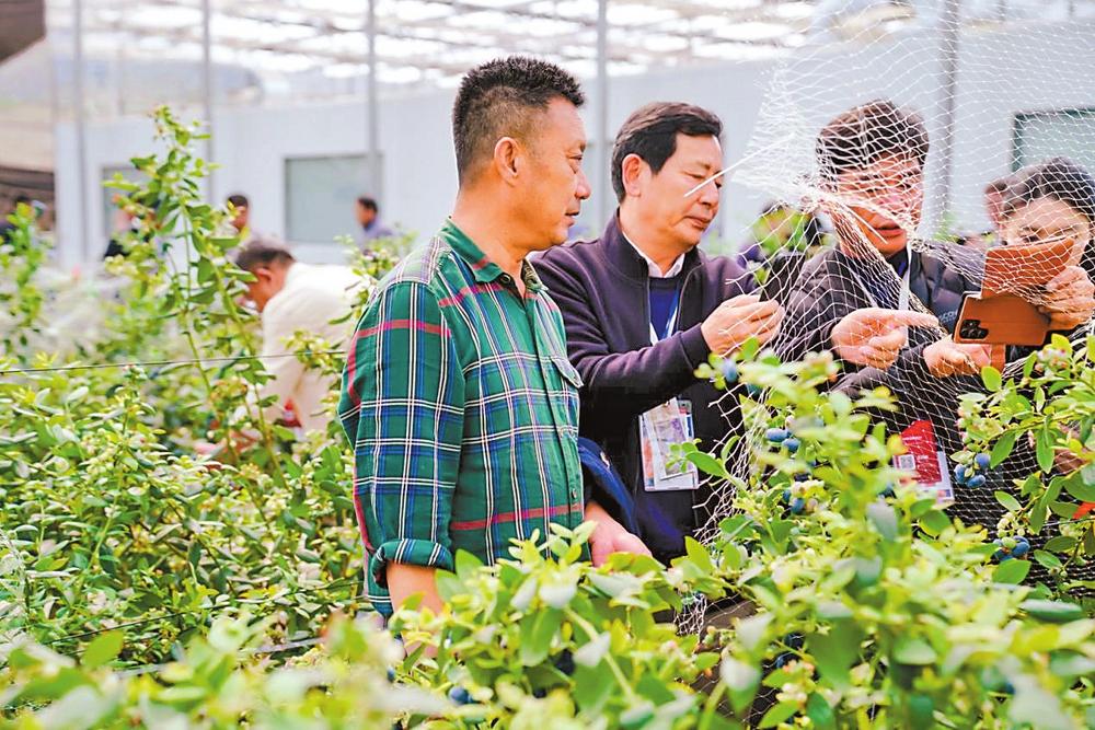 专家在石林台湾农民创业园蓝莓种植基地查看蓝莓长势。 石林县委宣传部供图