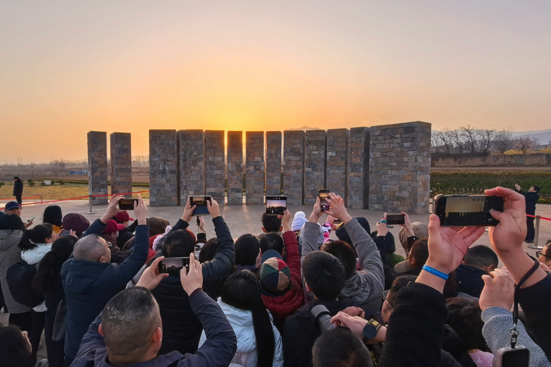 3月20日,山西省襄汾县,游客们在带着凉意的晨雾中久久守候日出的到来。7点10分,塔儿山的轮廓在天光里缓缓浮现,一束穿越四千年的阳光,精准穿过第7道观测缝隙,投射到观测点上,如约唤醒了昼夜均分的一天。