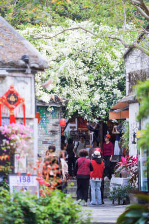 游客观赏甘坑古镇三角梅景观